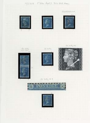 1858 2d Blue Pl.7 (SG45, Thick line, Wmk. Large Crown, Perf 14). A fine group of seven used examples including a watermark inverted example NL, various re-entries including HG “ST of POSTAGE” on neck and a superb cds used example KB. An Interesting group worth viewing. SG45, Spec. G2d/e/f. Cat £1,800+. (7)