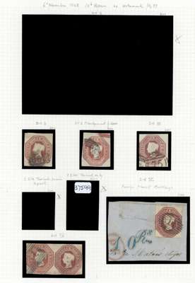 1847-54 10d brown & 1s Green embossed. A group of used embossed consisting of two four margin single 1s green (SG55) and a horizontal pair in deep green (SG56), also offered with four 10d Brown (SG57) and a horizontal pair. Additional with a part piece of Dickinson silk thread paper. SG54 & 57. Cat £12,500+. (9).