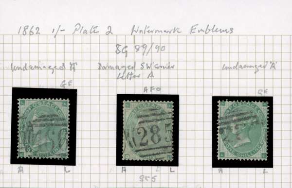 1862 1s Green Pl.1=2 (SG90, Wmk. Emblems). Used trio lettered AL with two examples showing normal corner letters and one showing the defective bottom left hand corner letter. Unusual, faults. SG90. Spec. J101(2)e. Cat £1150.