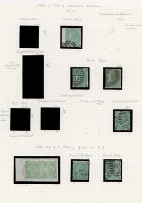 1865 1s Green Pl.4 (SG101, Wmk. Emblems). A fine group of eight used examples including two thick paper examples a watermark inverted example a horizontal pair with bottom leg of E missing on KJ. SG101. Spec. J103. Cat £2,200+. (8).