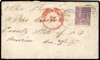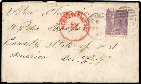 1869 6d Dull violet Pl.8. Overseas mail, envelope sent from Kidderminster to United States bearing a 6d Dull violet (SG108) lettered AJ showing double perforations variety (vertical sides appear rouletted), tied by a Kidderminster "415" duplex for NO.13.1869 with a red New York, Paid transit alongside for NO.24.1869. Toned and several tears to reverse and periphery of envelope. Scarce variety. 2003 BPA Cert. SG108, Spec. J76(1)e.