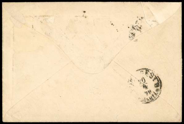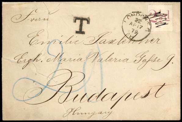 1879 Overseas Mail. Envelope sent from London to Budapest franked with the sheet selvedge “2½d” printed in Rosy-mauve (SG138-141) tied by a London E.C. cds for AP.17.1879. Selvedge cancelled in manuscript and postage due charged upon arrival. Envelope ripped and re-joined at left from rough opening. A spectacular attempt at postal fraud.