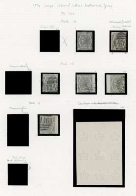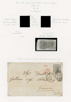 1874 6d Grey Pl.13-17 (SG 146/7, Wmk. Spray) & 6d Grey Pl.17-18 (SG161, Wmk. Crown). A group of thirteen used examples, one cover, a trial and a block of crown watermarked paper. Included two watermark inverted examples. SG146-147 & SG161. Spec. J83-89. (16).
