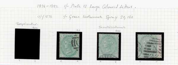 1873 1s Green Pl.8-13 (SG148/150, Wmk. Spray). A fine group of fourteen used examples including a watermark inverted example from Pl.13 (AG), a plate number marginal from Pl.8, and additional used examples with cds cancellations. SG148/150. Spec. J108/113. Cat £2,200+. (14).