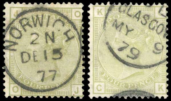 1877 4d Sage green Pl.15 & 16 (Wmk. Inverted). Two cds used examples, Pl.15 (OJ) & Pl.16 (CK) both showing this difficult watermark variety. Scarce cds examples. SG153wi. Spec. J64c & J65c. Cat £1,250.