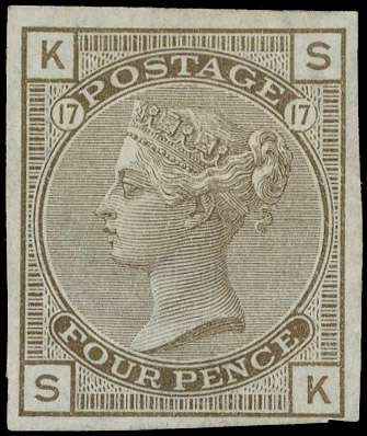 1877 4d Grey-brown Pl.17 (Wmk. Garter). Very fine unused o.g. imperforate example lettered SK, close but clear at lower …