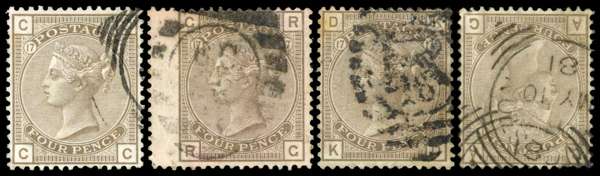 1880 4d Grey-brown Pl.17 (SG154, Wmk. Large garter). A group of four used examples including a watermark inverted example (AG). Some minor faults but a presentable group of this difficult issue showing examples from both the Somerset House and DLR perforations. SG154. Spec. J67. Cat £2,700. (4).