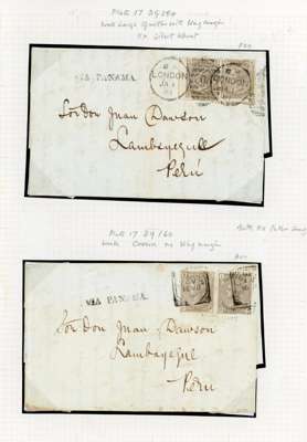 1880 4d Grey-brown Pl.17 (SG154, Wmk. Large garter & Wmk. Crown). A most unusual matched pair of double rate entires sent from London to Lambayeque, Peru from the same correspondence. The first cover bearing two (SG154, BG/BH) on garter watermark paper, one with a wing margin.. The second cover has two (SG160, GF, OL) on crown watermark paper. Both letters were routed via Southampton, on a Royal Mail Steam Packet ship to Chagres and across the Isthmus by Panama Railway to Panama City on the Pacific coast, then via a Pacific Steam Navigation Company packet to Callao and inland via Lima to Lambayeque. Spectacular pair of covers. SG154 (Ex. Gilbert Wheat) & SG160. Cat £1850+.