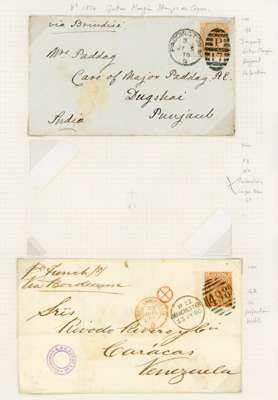 1876 8d Orange Pl.1 (SG156, Wmk. Large Garter). A fine group of nine used examples including two horizontal pairs and a watermark inverted example one example showing full wing margin guillotined along adjacent stamp also offered with two covers both at the 8d rate one to India and the other to Venezuela. Worth viewing this fine group from this difficult issue. SG156. Spec. J91A. Cat £4950. (9).
