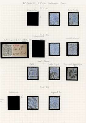 1881 2½d Blue Pl.21-23 (SG157, Wmk. Crown). A group of nine used examples including an odd variety showing a slight doubling/kiss print and a watermark inverted example from plate 22 (QJ) also including a Pl.21 die proof from the striking book. Minor faults. SG157. Spec. J23-25. Cat £2,400+ (10).