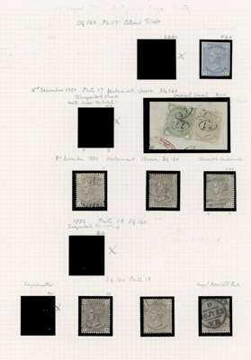 1880 4d Grey-brown Pl.17 & 18 (SG160, Wmk. Crown). A fine group of 4d examples including a 4d Pl.17 colour trial in blue on watermark large garter paper, a watermark inverted example and other used piece. Difficult issue. SG160. Spec. J68/69. Cat £5,000+. (8).