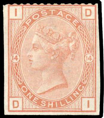 1881 1s Orange-brown Pl.14 (SG163, Wmk. Crown). Imperforate imprimatur lettered DI showing partial perforations along top edge. Light wrinkle. SG163var. Cat £3,800.