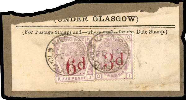 1883 3d on 3d Lilac & 6d on 6d Lilac. Parcel post label bearing a 3d on 3d (SG159) and a 6d on 6d (SG162) tied by Old Kilpatrick Glasgow cds' for FE.14.1884. Scarce and unusual. SG159 & SG162.
