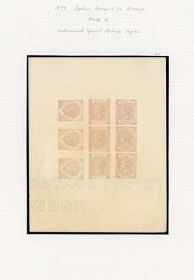Great Britain 1879-80 Tender Essay Perkins Bacon imperf sheets in blue and pale brown