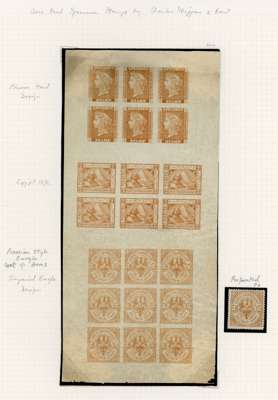 1880 Charles Skipper & East Tender Essays. Spectacular ungummed, imperforate sheet printed in yellow-brown. bearing six Ceres head examples at top with six Egypt 1872 issues below with a block of nine Prussian imperial eagle design. Very scarce and unusual.