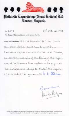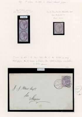 1881 1d Deep purple (SG172, Die II, 16 dots). Three unused o.g. examples (vertical pair and a single) and an example used on a clean envelope all printed in lilac on blued paper. Single with 1969 BPA Cert and the pair and cover with PEGB Certs. Rare and unusual. SG173g. Spec. K8a. (3).
