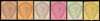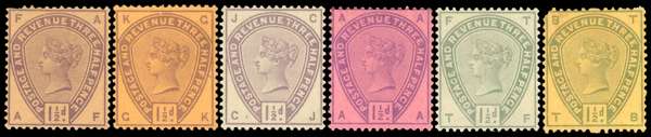 1884 1½d Colour trials on coloured paper (No Wmk. Perf. 14). Lovely group of six colour trials