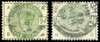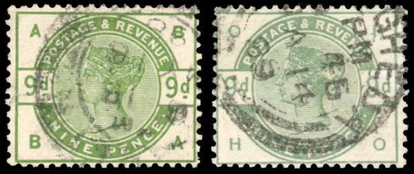 9d Dull green. Two forgeries (BA & HO) on genuine watermarked paper with genuine original cancellations (the method was ingenious, the designs of used lower values were faded out and the forged 9d. impression then printed over the top), BA with light crease and small closed tear at left, otherwise fine. These dangerous imitations are though to be the work a Belgian counterfeiter called Lucian Smeets. SG195var.