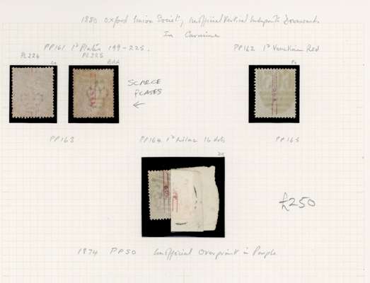 1858-71 Oxford Union Society (O.U.S.), unofficial underprints and overprints. Group of both underprints and overprints of the Oxford Union Society consisting predominantly of 1d Rose-reds (SG40, 42 & 43's) but also containing forgeries, 1d Venetians and 1d Lilac's. An interesting group worthy of viewing. Spec. PP220-PP237, (21).