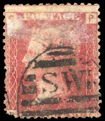 1864 Smith, Elder & Co, London, unofficial underprints. Used example with underprint in red, 1d Rose-red Pl.96 (PC) cancelled by a numeral cancel. Corner faults and damaged perforations. Very rare, previously unrecorded on this plate with a red underprint. Spec. PP282.