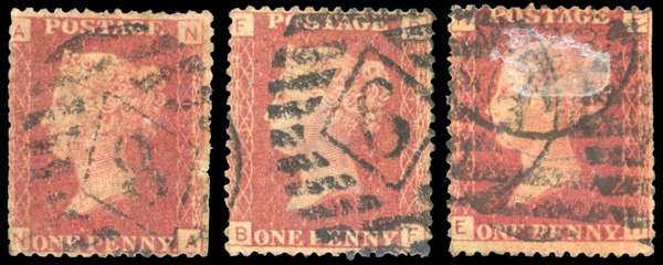 1868 Smith & Lister, unofficial underprints. Three used examples with underprint in black reading upwards, 1d Rose-red Pl.129 (NA), Pl.137 (BF) & Pl.138 (EH). Toned, trimmed perfs and creasing. Scarce group. Spec. PP284. Cat £2,025. (3).