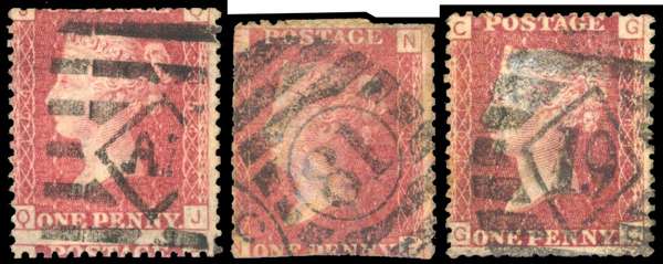 1868 J. Tylor & Sons, 2 Newgate St unofficial underprints. Three used examples with vertical underprints in black, one reading upwards 1d Rose-red Pl.154 (QJ) and two reading downwards 1d Rose-red Pl.198 (NF), 1d Rose-red Pl.201 (GC). Some perforation faults and light wrinkles. Scarce. Spec. PP294 & PP295 (2). Cat £1,875. (3).