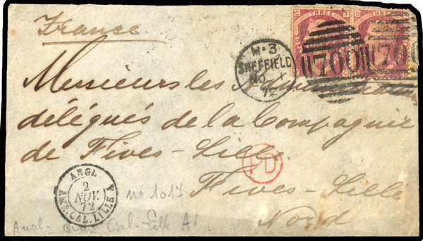 1868 Vickers, Sons & Co, Limited, Sheffield unofficial underprints. A front addressed to Lille, France bearing a horizontal pair of 1½d Lake-red Pl.1. (SG52) hinged to front and showing overprint on reverse of stamps SG52, PP301. Cat £850. 2004 RPS Cert.