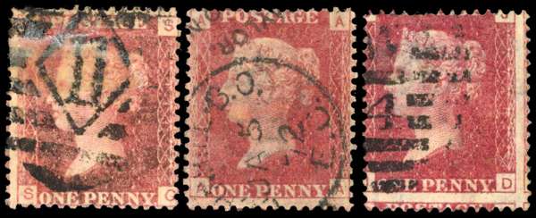 1868 Naylor, Benzon & Co., London, unofficial underprints. Three used examples with underprint (Type 49) in black, 1d Rose-red Pl.111 (SO), Pl.127 (AA) & Pl.148 (JD) cancelled by a London cds and partial strike of a Naylor, London cachet, unusual. A few blunt perforations as usually seen. Scarce group. Spec. PP205. Cat £1,575. (3).