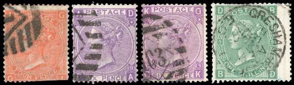 1868 Naylor, Benzon & Co., London, unofficial underprints. Group of four used surface printed examples with underprint (Type 49) in black, 4d Vermilion Pl.11 (GI), 6d Violet Pl.8 (DA), 6d Violet Pl.9 (GK) & 1s Green Pl.5. (BD). A few minor peripheral faults as usually seen. Scarce group. Spec. PP208, PP209 (x2) & PP210. Cat £3,125. (4).