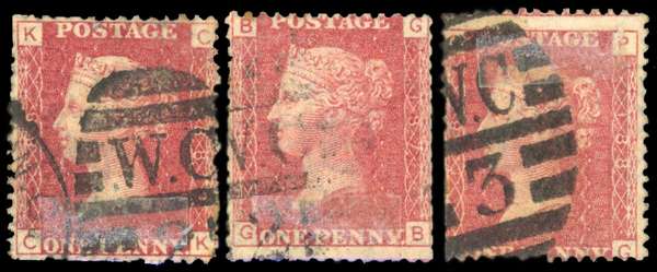 C.1876. Country Milk Company London, unofficial underprints. Three used examples all bearing portions of a blue oval protective handstamp used as an underprint, two 1d Rose-red Pl.188 (PG & CK) & Pl.187 (GB). Some trimmed perforations and tone spots nevertheless unusual.