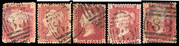 1868-74 Harvey & Portway B. Stortford/James Harvey B.Stortford unofficial underprints. Group of five used examples with underprint (Type 32 & 33) in black, 1d Rose-red Pl.123 (Type 33, LI), the remaining four type 32, 1d Rose-red Pl.146 (TD), Pl.158 (DC), Pl.164 (IF) & Pl.199 (GK). All cancelled by Bishop Stortford ‘83’ numeral/duplexes. Some minor faults, scarce group. Spec. PP132 (x4) & PP133. Cat £2,750. (5).