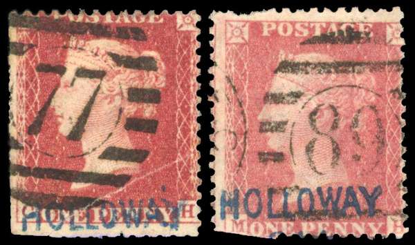 1860 Holloway, 224 Strand unofficial overprints. Two used examples with overprint (Type 39) in blue on 1d Rose-reds Pl.43 (SG40, CH) & Pl.55 (SG40, MH). Both with trimmed perforations in places. Spec. PP155. Cat £1,400.