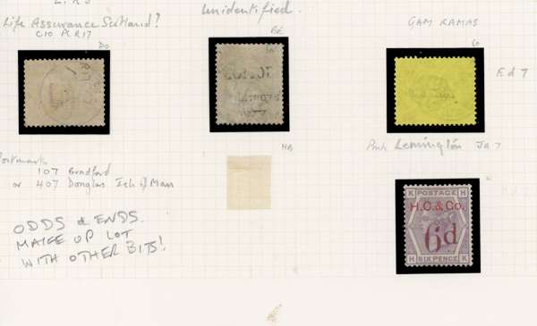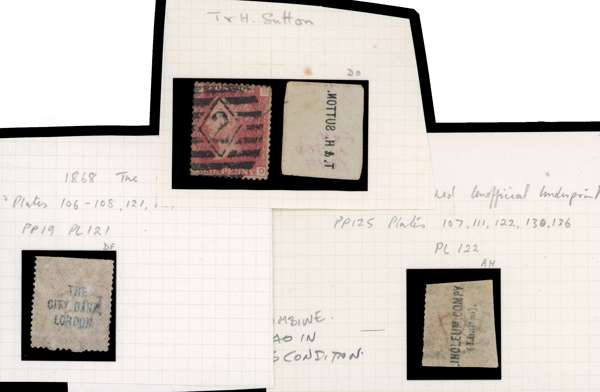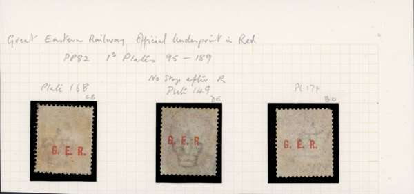 1870-1910 Underprints & Overprints. Balance of underprints and overprints consisting of both both Queen Victoria and Edward VII issues, including an attractive “H.C. & Co.” overprint on 6d on 6d (SG162), a group of three 1d Rose-reds with “G.E.R.” Great Eastern Railway underprints, 1d Rose red with “City Bank London” plus other underprints etc. An interesting group of ten stamps and one cover (11).