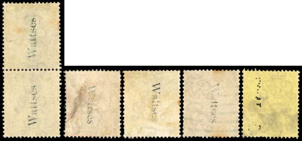 1912 Wattses of Manchester underprints. Very fine group of five King George V definitives each with 'Wattses" underprints in black (Type 2, 14mm wide reading down except 4d), vertical pair of 4d Grey green (Reading upwards, unlisted), 1d carmine (Die 1B, Wmk Crown, SG329, unlisted), ½d Green (SG351, unlisted), 1d Scarlet (SG357, PP252) and an additional 8d black/yellow with indistinct underprint (SG390). Scarce group. (5).
