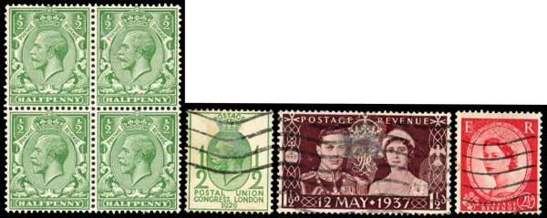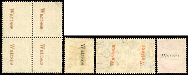 1924-37 Wattses of Manchester underprints. Very fine group of King George V & VII issues each with 'Wattses" underprints. Consisting of an unused o.g. block of four ½d Green (SG418) with underprint reading down in red-brown, ½d P.U.C. (SG434) underprint reading down in black, 1937 1½d Coronation of King George VI (SG461) with two underprints reading upwards in orange, offered with a 2½ QEII wilding believed to have a fake underprint. Unusual group, unlisted by SG (4).