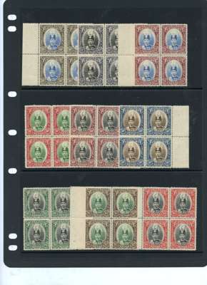 1937 set of nine in side-marginal blocks of four, large part o.g., only one stamp in each block hinged. A few shorter perfs and the 10c and 25c with a very small foxed spot on reverse, still a nice set of blocks, ex Dr Woods. SG 60-8, £1200