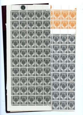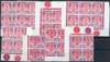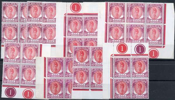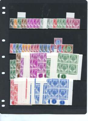 1950-5 set mint with 16 extras, mostly shades per CW catalogue, including 8c deep green; blocks of four, nearly all from sheet corners, mostly Plate blocks of 3c (2), 4c, 5c (7), 8c green (5), 12c (4), 20c blue (5), 30c (2), 35c (5 plus block of 8), 40c (3); and larger blocks - 1c sheet plus Plate blocks of 40 and 15, 2c sheet, 3c and 6c Plate blocks of 20, 8c scarlet Plate block of 40, 15c Plate block of 16, 20c black and green and 20c blue Plate blocks of 20. All fine unmounted o.g. SG 76-90, £1937