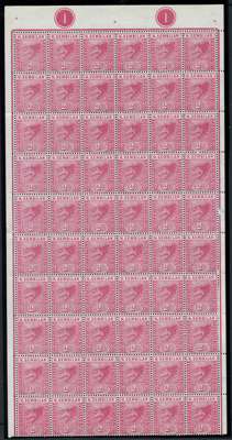 1891 2c rose upper left pane of sixty (no bottom selvedge) with R8/3 short ‘N’, unmounted o.g. Marginal thin by R5/6, otherwise fine and unusual in this format. SG 2, a, £444