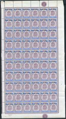 1898-1900 4c on 8c dull purple and ultramarine, surcharge in green. Right pane of sixty, o.g., some faults including R9 creased; minor type varieties, an interesting study piece. SG 19, £960