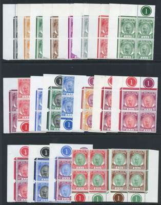 1950-6 set of twenty-one in Plate blocks of four o.g., several including the $2 and $5 hinged on the selvedge only, all stamps unmounted. SG 53-73, £520
