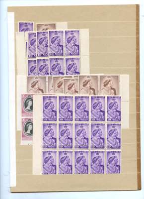 1948 Silver Wedding blocks including $5 imprint block of eight and three Plate blocks of four, also singles, 10c blocks and 10c Coronation Plate blocks (3). All unmounted o.g. with more-or-less toned gum. SG 1-2
