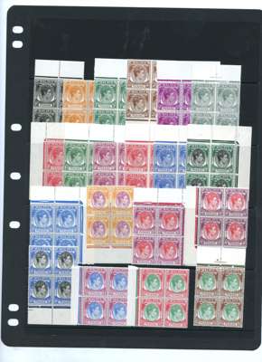 1949-52 set of twenty in unmounted o.g. blocks of four, the 8c scarlet with a discoloured inclusion affecting one stamp, otherwise fine. SG 3-20, £560