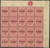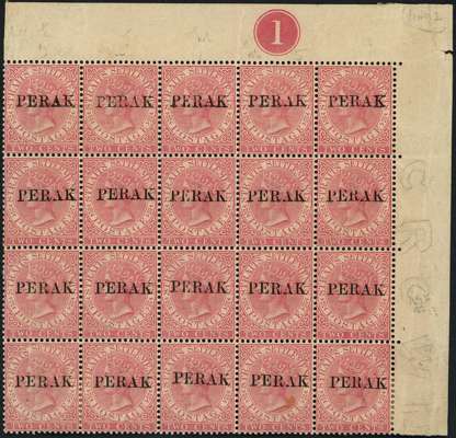 1884 2c pale rose top right corner block of twenty with Plate 1, part to full o.g. (quite yellowed). Central vertical column overprinted Type 15, a few stamps with minor condition issues (R4/9 minor stain, splitting between R4/9-10) but the Type 15 stamps are OK. SG 17 x 16, 18 x 4