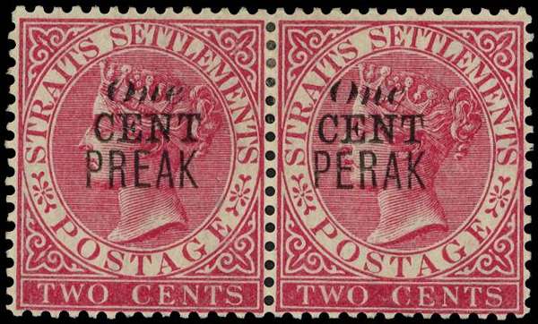 1887-9 1c on 2c pale rose horizontal pair, left stamp with R6/1 PREAK error, fine large part o.g. SG 35, a, £985