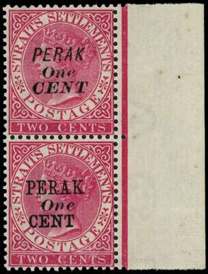 1891 1c on 2c bright rose right marginal vertical pair, upper stamp surcharge Type 30, lower stamp Type 41. Unmounted o.g., very slight gum disturbance on the upper stamp, but a very rare se-tenant pair. SG 53-4, £1200+