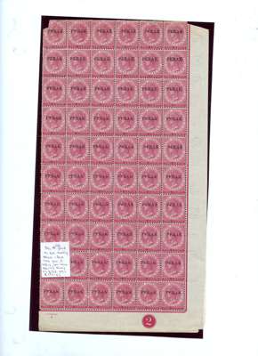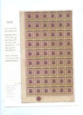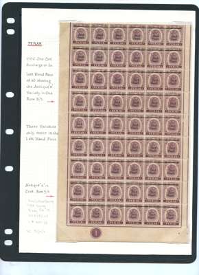 1900 1c on 2c and 1c on 5c left panes of sixty, folded for display on album pages. Each with R5/2 and 9/4 ‘Antique e' varieties. Gum brownish and with some minor defects, but displaying nicely. Also SG 19a right pane of sixty without top and left selvedge, the top row poor and some other minor defects, o.g. SG 81, a, b, 83, a, b
