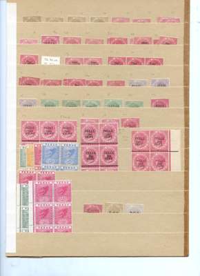 1880-95 mint range on stocksheet with overprints and surcharge, mixed condition but highly catalogued. Includes SG 5, 7 (part o.g.), 19 (large part o.g.), 21 (part o.g., adhesion), 34 pair (one with large adhesion), 34-5 strip of 3 (34 with an unobtrusive crease, the 35 pair with large adhesion), 41 (discoloured hinge remainder), 43-5 all with toned gum, 48-52 toned o.g. with some defects, SG O1-3 heavily hinged. Also some later blocks. Viewing recommended