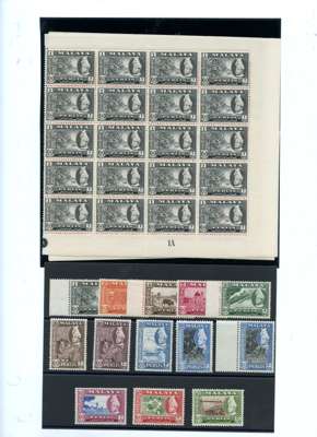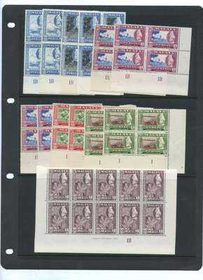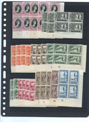 1953 Coronation Plate blocks of four (4); 1957-62 set singles and in Plate blocks of four x 2 (10c deep maroon one only); other Plate and imprint blocks including 10c deep maroon Plate and imprint block of ten. Mostly with gum somewhat toned although the 10c deep maroon block of ten is quite nice. SG 28-40