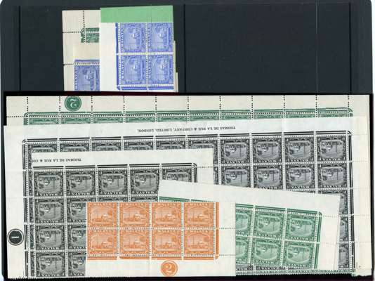 1935-41 small selection of mint blocks. Blocks of four of 1c, both 2c, 5c, 6c, 8c, 10c and 50c, hinged on one stamp only. The remainder unmounted o.g.; 1c lower five rows (splitting) and corner block of 20; 2c green two blocks of ten; 2c orange Plate block of 8 (R9/10 scratch at lower right of vignette); 3c lower six rows (lightly two-toned gum, R9/10 scratch) and top right corner block of 15, R2/8 white smudge at lower right of vignette (constant); 15c top left corner block of four (hinged on selvedge) and Plate block of 6 with R9/10 scratch (two-toned gum). SG 68/82