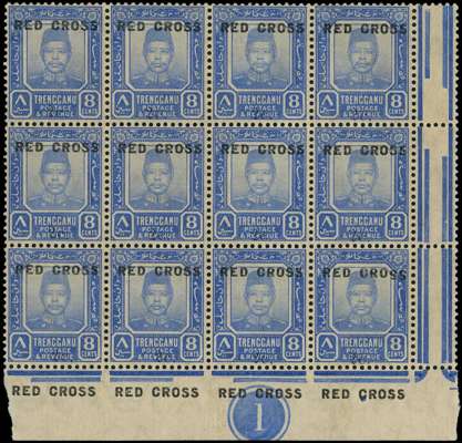 1917-8 Red Cross 8c + 2c Plate block of twelve with Plate number, R10/6 with ‘SS’ inverted, o.g. Gum toned, otherwise fine and a scarce multiple. SG 22b, £1000